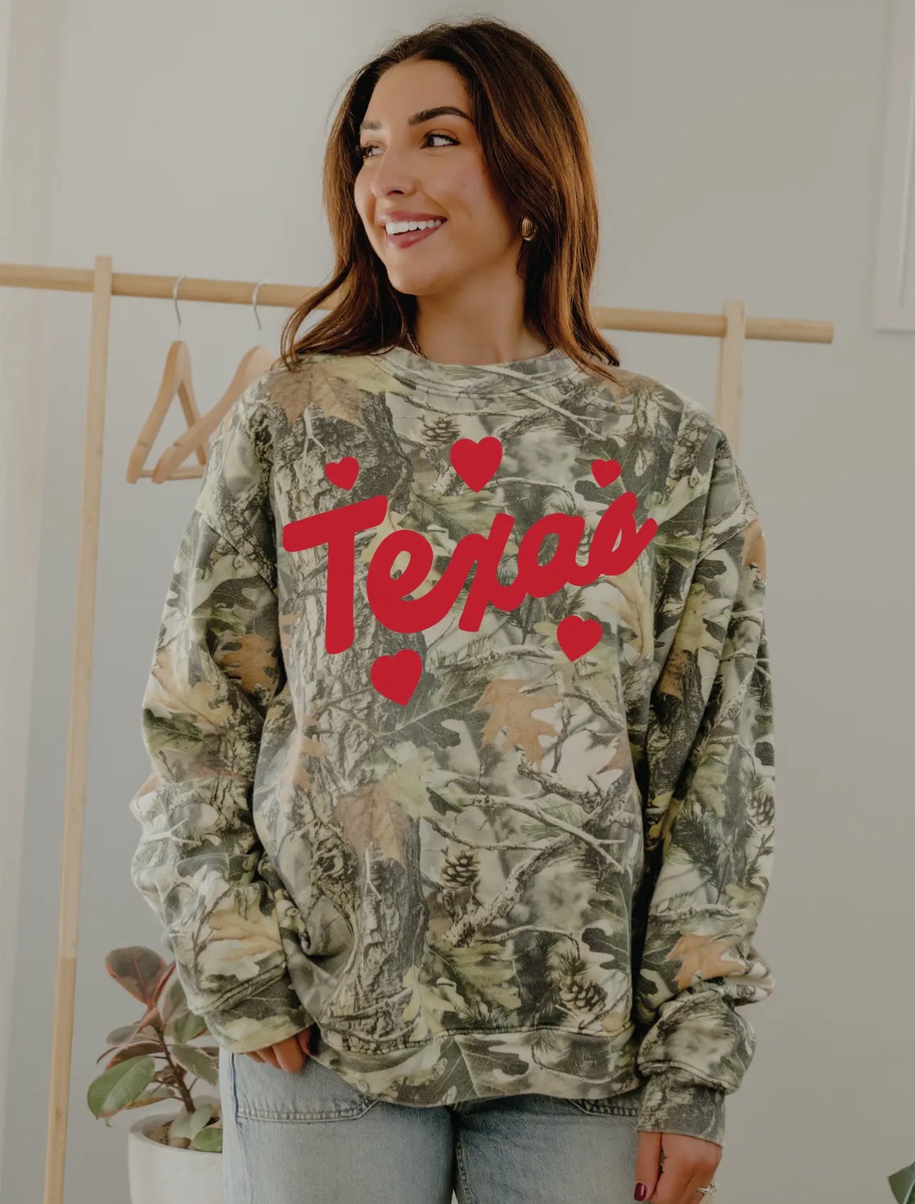 Our favorite Camo sweatshirt with Texas & Hearts in Red.